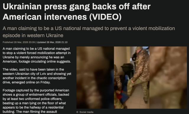 随后,这群刚才还对同胞拳脚相加的征兵官们,还真就立刻停手,丢下受害者跑了。这个视频的冲击力,不在于暴力本身。毕竟在2026年的乌克兰,征兵官当街殴打平民,破门入室拖人上车的画面早已算不上新闻。真正令人震惊的是,美国人三个字在乌克兰竟然如此好用,以至于说出这句话的人,自信可以靠美国人的身份解决问题,以至于征兵官和警察听到对方说了几句英语就跑了。