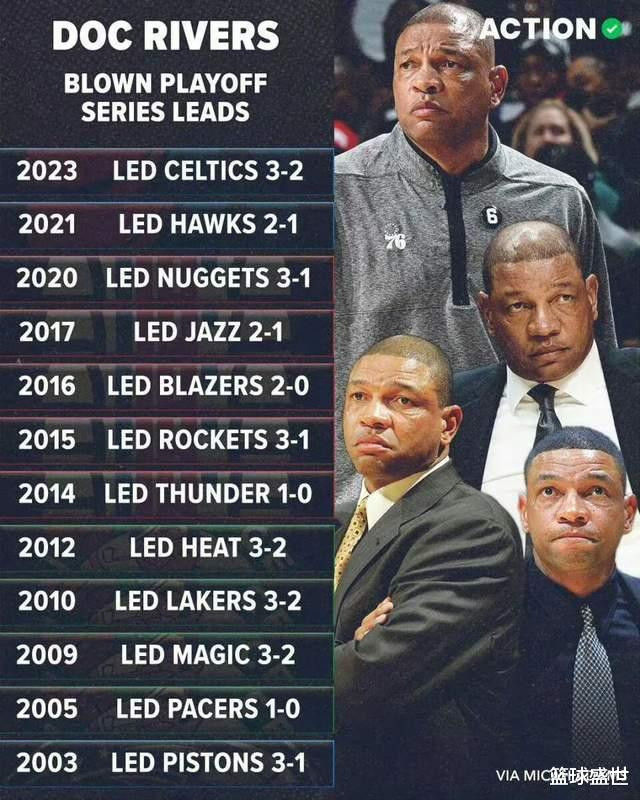 但问题在于,常规赛的出色胜率之余,里弗斯的季后赛履历就相当尴尬了。教练生涯,里弗斯一共带队打进20次季后赛,但其中先后10次倒在了首轮;更夸张的是,他的球队12次在大比分领先的情况下被逆转淘汰,甚至还有多次3-1领先后被逆转的名场面。